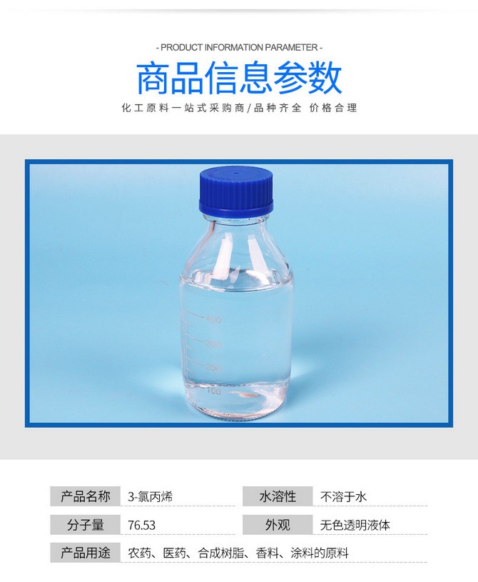2.兼有烯烴和鹵代烴的反應(yīng)性,是甘油、環(huán)氧氯丙烷、丙烯醇等的有機(jī)合成中間體。也用于農(nóng)藥、醫(yī)藥的原料。還可用作合成樹脂、涂料、粘結(jié)劑、增塑劑、穩(wěn)定劑、表面活性劑、潤滑劑、土壤改良劑、香料等精細(xì)化學(xué)品的原料,主要用于制造環(huán)氧氯丙烷、甘油、氯丙醇、丙烯醇、農(nóng)藥殺蟲雙、醫(yī)藥、樹脂、涂料、粘合劑,以及丙烯磺酸鈉,潤滑劑等。